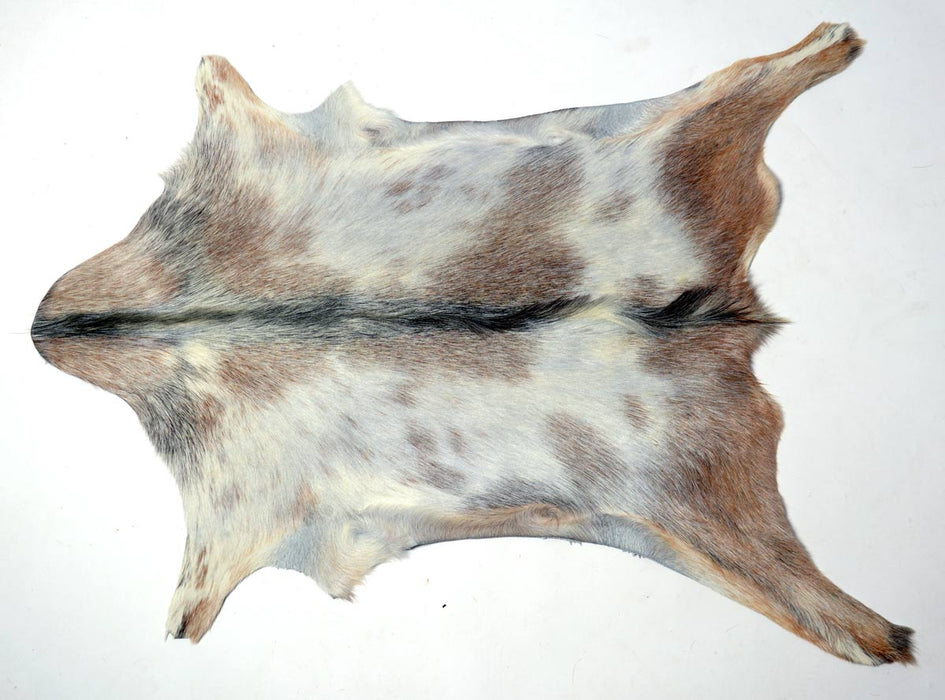These goat skin rugs can be used on the floor or draped over furniture. The natural beige & grey hair is so glossy and the hair is soft to touch. This goatskin is a very unusual colour combination. Animals have less hair in the armpit areas so expect that with goat skins.