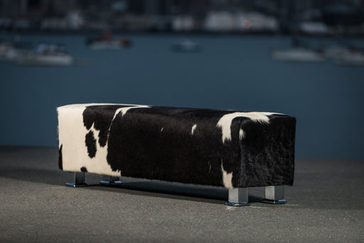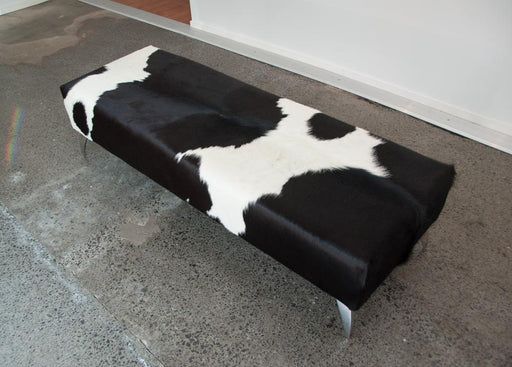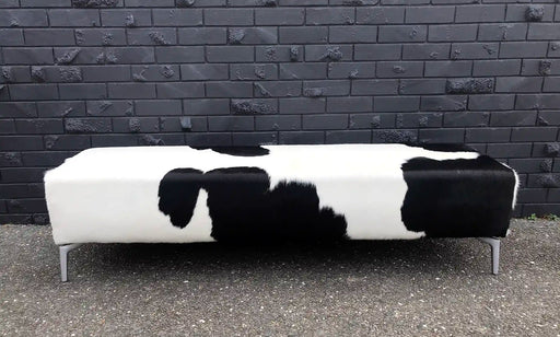 View full detailsBlack & white cowhide bench ottoman with modern metal legs 180cm x 50cm x 45cm tall. Gorgeous Creatures make beautiful custom made cowhide otto...