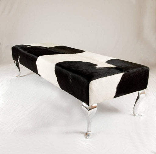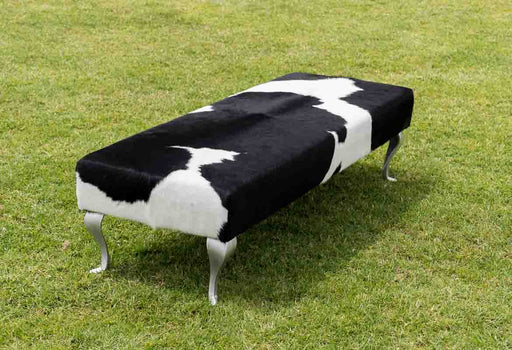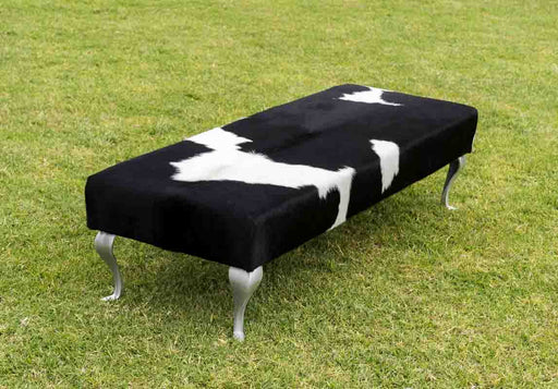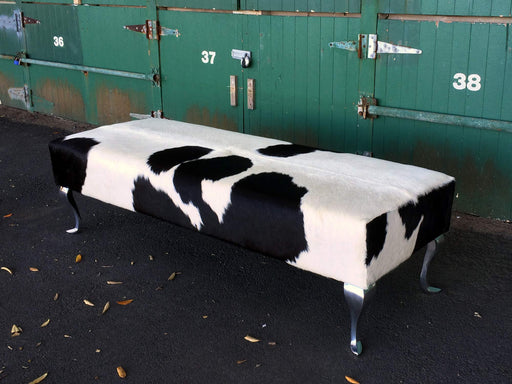 View full detailsLong bench ottoman covered in black & white cowhide with modern Queen Anne metal legs 160cm x 55cm x 40cm tall. Gorgeous Creatures make beautif...