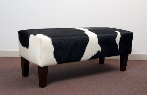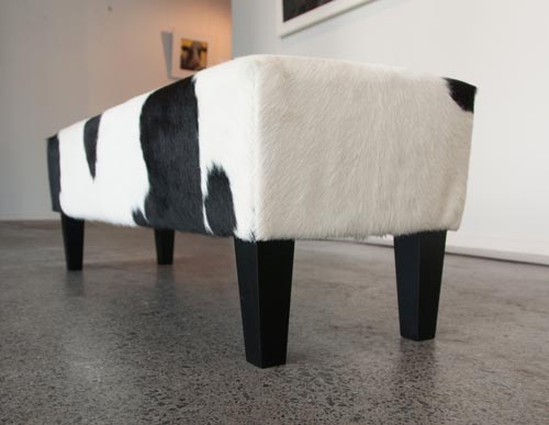Cowhide long bench ottoman 110cm x 40cm x 40cm tall with extra tall legs. Great for a hallway, entranceway or under a window as a window seat. A be...