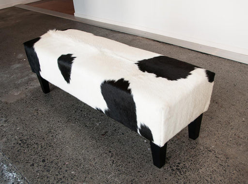 View full detailsBench seat ottoman in black & white cowhide 100cm x 40cm x 40cm tall. Great for a hallway or the end of your bed. Gorgeous Creatures make beaut...