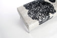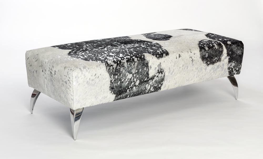 Black & white cowhide ottoman with silver speckles, long bench ottoman 130cm x 55cm x 40cm tall.