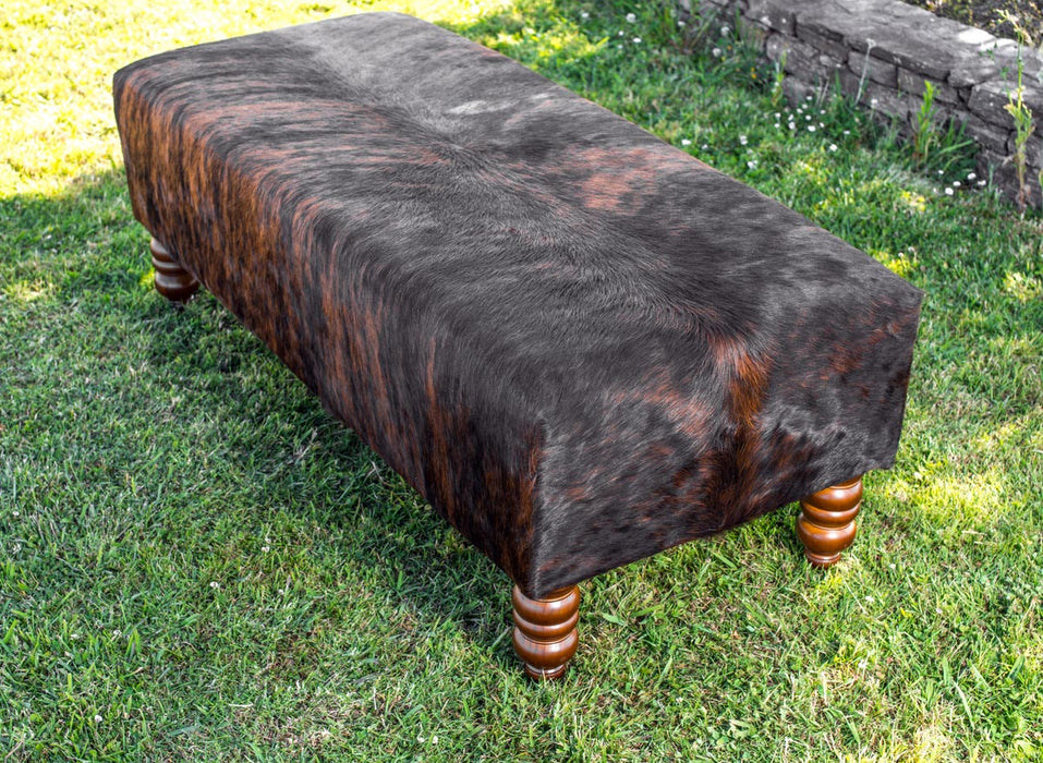 Dark exotic brindle cowhide ottoman large rectangle with turned wood legs 138cm x 60cm x 50cm tall.