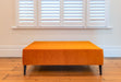 This rectangle ottoman was covered in a bright orange 'dry-look' velvet fabric. A dry velvet looks more matt than a shiny 'wet' velvet. You can choose from a wide range of beautiful velvet colours.
