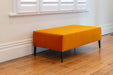 Orange velvet fabric ottoman with black metal legs 125cm x 70cm x 43cm tall.