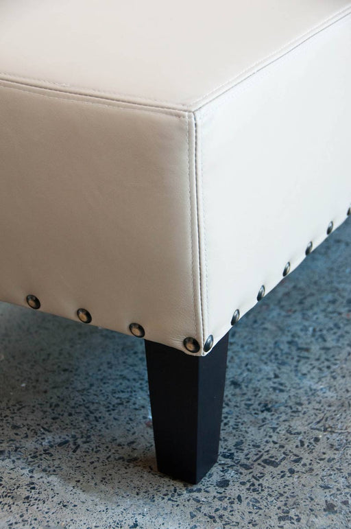 View full detailsA beautiful beige leather ottoman with wood legs and studs 100cm x 60cm x 40cm tall. Gorgeous Creatures make beautiful custom made leather ottomans...