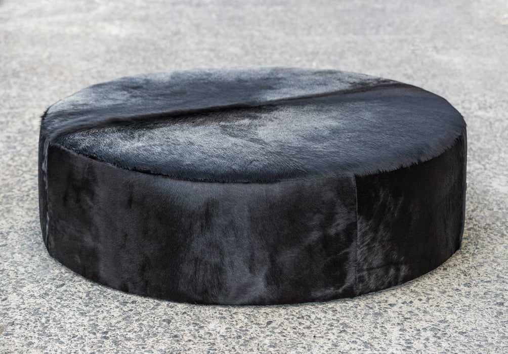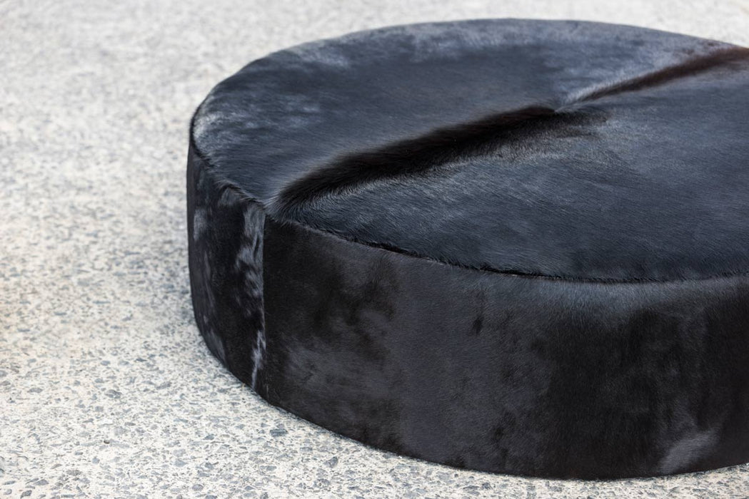 An extra large deep natural black cow skin ottoman with invisible glides 130cm x 130cm x 35cm tall.