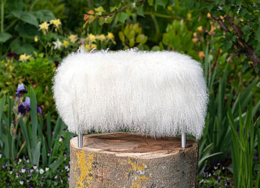 View full detailsAn absolutely gorgeous footstool. This adorable curly white Tibetan sheepskin footstool will add soft texture to your home. These Tibetan or Mongol...