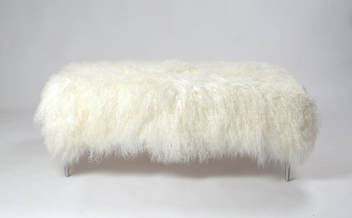 View full detailsIvory White Tibetan Lambskin ottoman 90cm x 60cm x 38cm tall with metal legs. A gorgeous frothy statement piece of furniture. We must confess, we h...