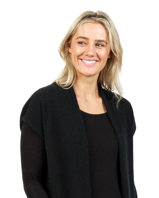 View full detailsA modern spin on a knitted long gilet vest in Black possum merino wool for women. Available in three classic colours. A gilet vest is like a sleev...