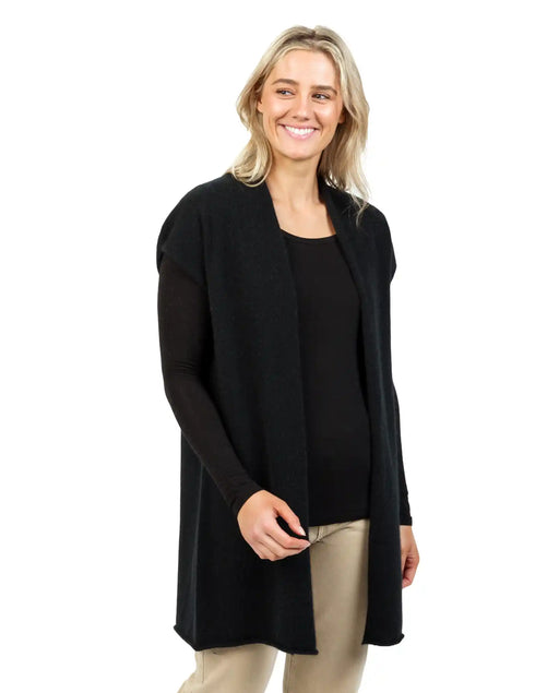 A modern spin on a knitted long gilet vest in Black possum merino wool for women. Available in three classic colours. A gilet vest is like a sleev...