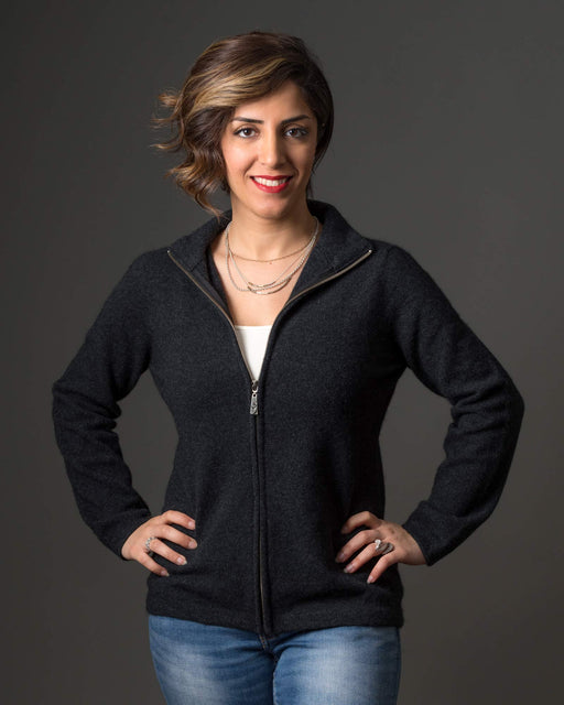 View full detailsA new season dark silver zip-front possum merino wool jacket for women. Warm and comfortable for winter. This lovely dark silver grey women's meri...