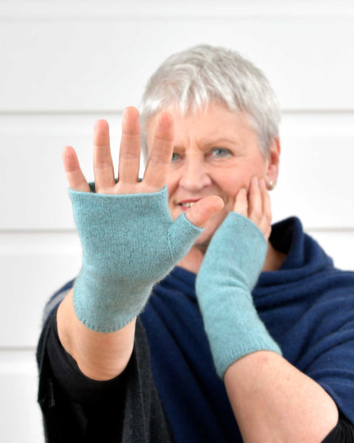 View full detailsPossum merino wool fingerless hand warmers. A beautiful topaz aqua colour. What a great idea! Like gloves but not gloves, these short wool hand wa...