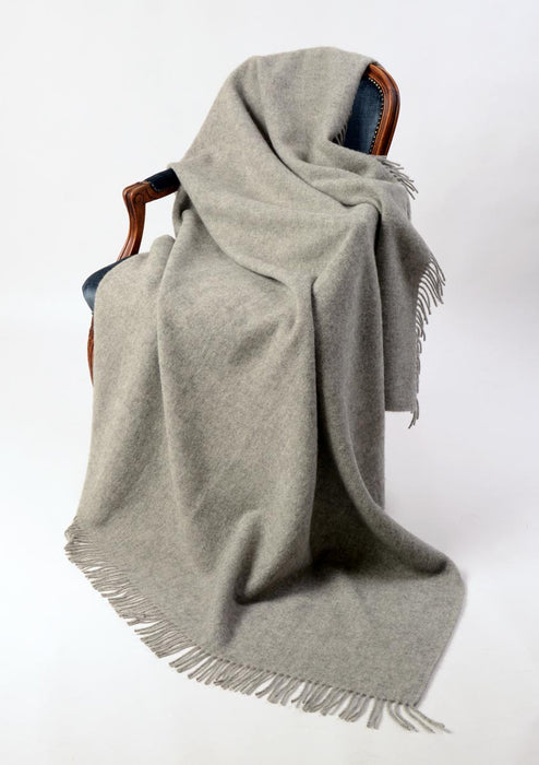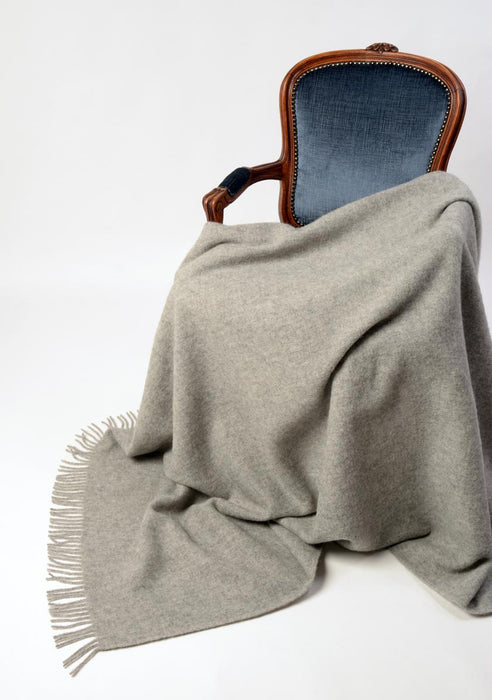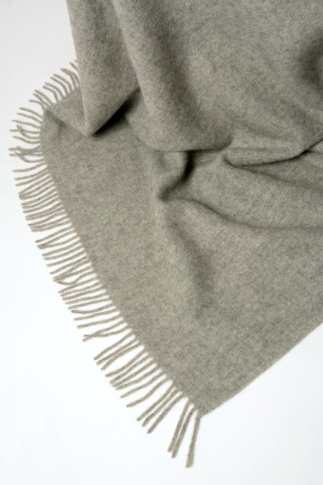 A modern 100% New Zealand lambswool throw blanket in classic slightly warm ash grey. A beautiful plain mid-weight wool blanket with tassels.