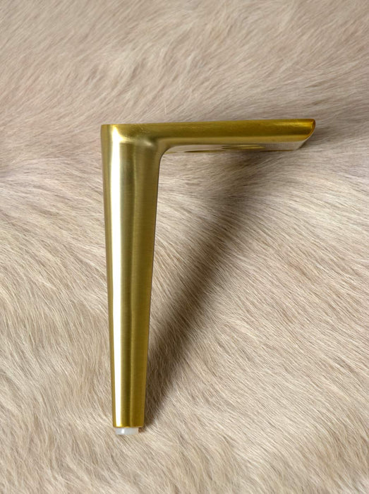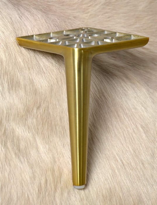 These metal furniture legs are slim and taper in from the top giving any furniture a refreshingly modern feel. The gold surface is a brushed matte finish. Use on a sofa, ottoman, or bathroom and kitchen cabinets.