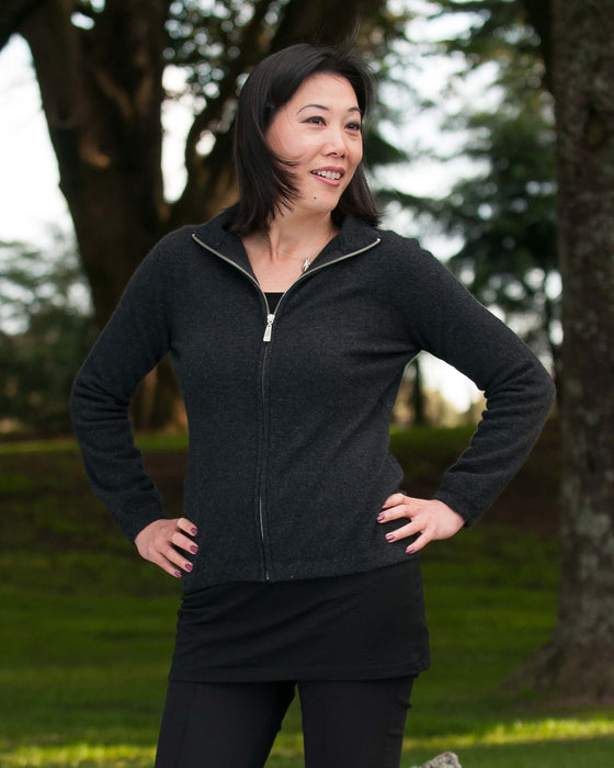 This best selling charcoal women's possum merino jacket has a front zip.