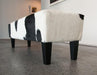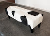 Long bench ottoman in black & white cowhide 120cm x 40cm x 40cm tall. Monochrome style for an entranceway or hallway.