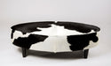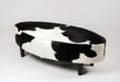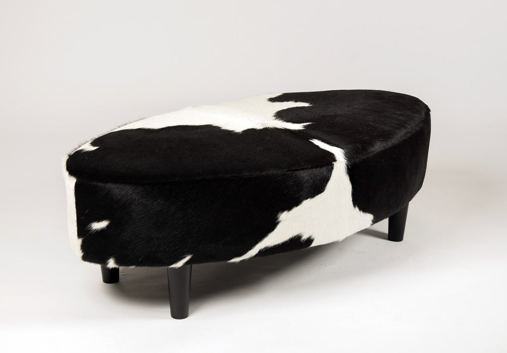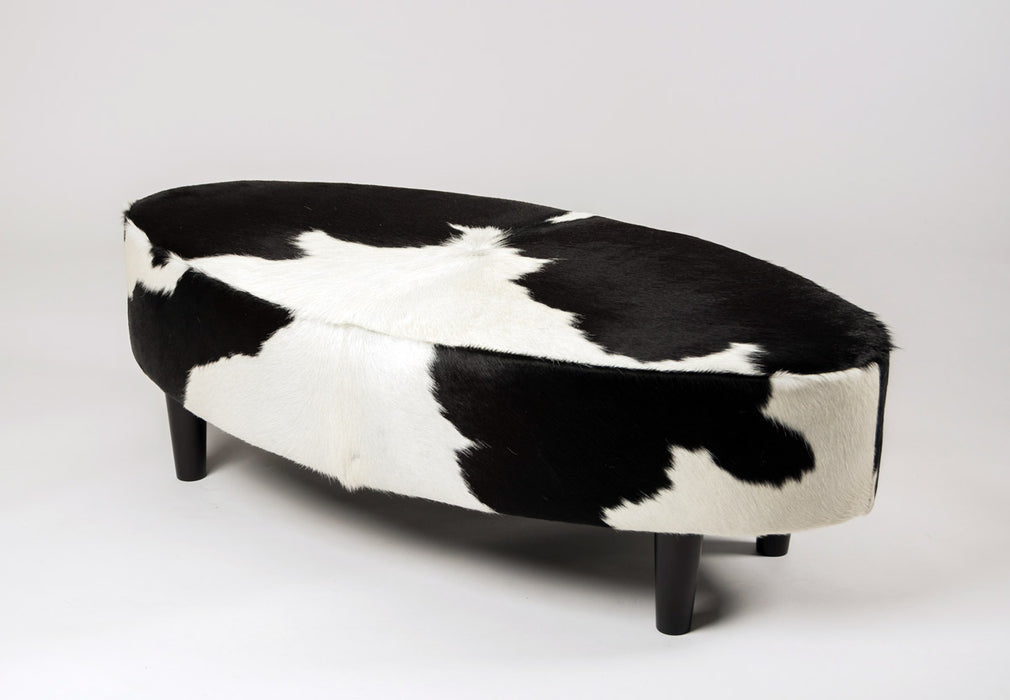 An oval cowhide ottoman made from a black & white cow skin with wood legs 120cm x 60cm x 38cm tall.