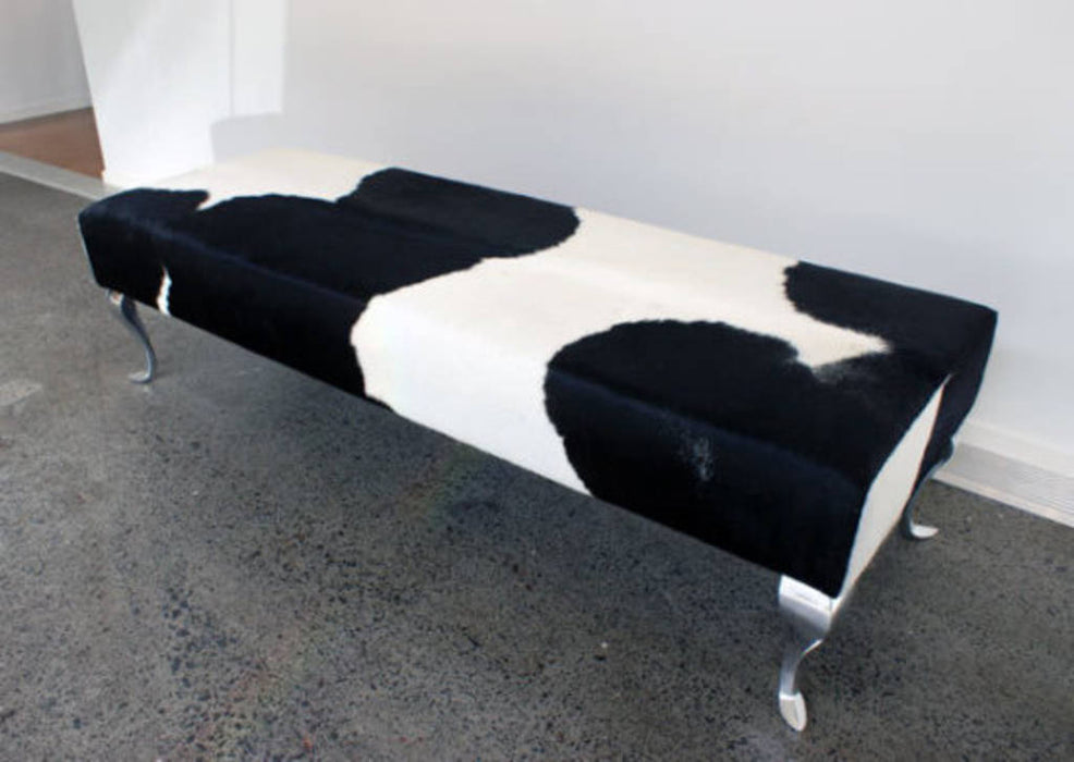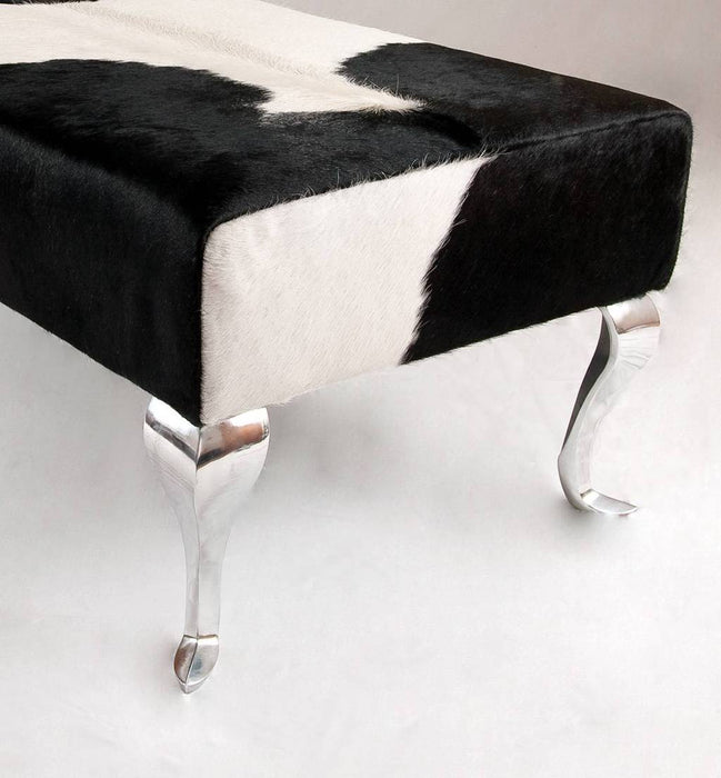 Black & white cowhide bench ottoman with modern Queen Anne metal legs 160cm x 55cm x 40cm tall.