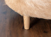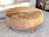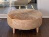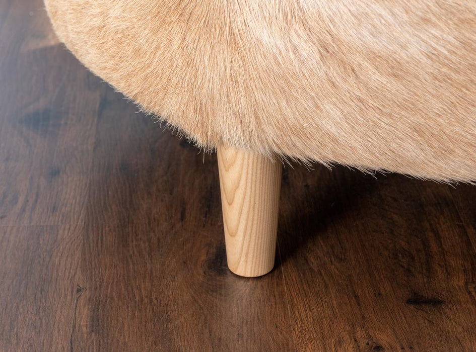 A round cowhide ottoman made from beige cow skin with round light wood legs 95cm x 95cm x 40cm tall.