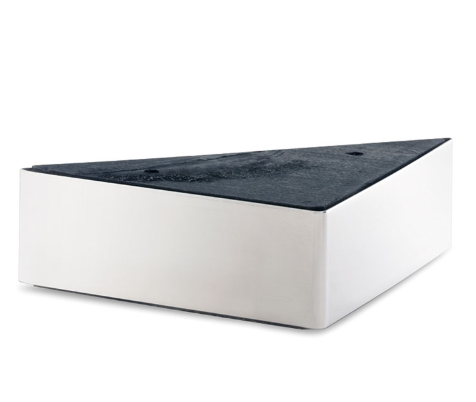 If you just want a hint of metal on a very low furniture foot this is a perfect low option. The surface is polished stainless steel. They are 11cm wide on two visible sides (shape is a triangle)