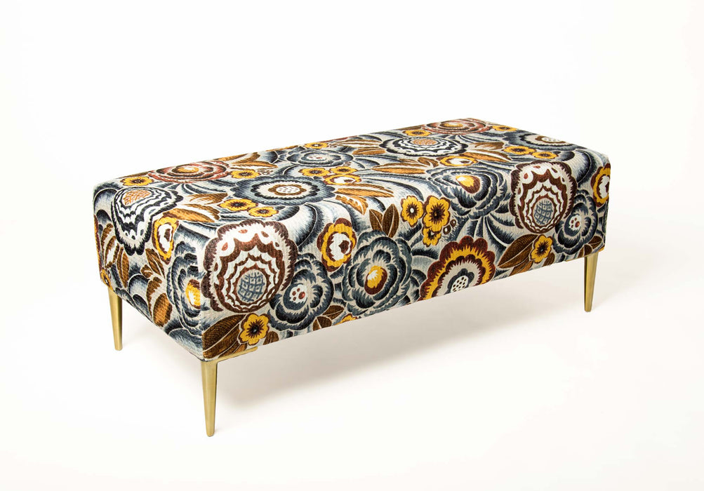 Laurie floral velvet designer fabric ottoman 100cm x 45cm x 38cm tall with gold legs.