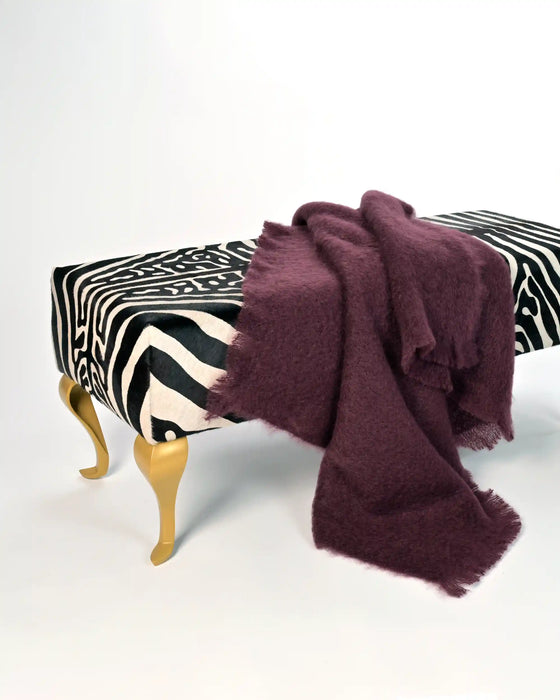 A mulberry wine NZ made mohair chair throw 130cm x 100cm (51” x 39.5”) the perfect size to cover your legs or wrap around your shoulders.