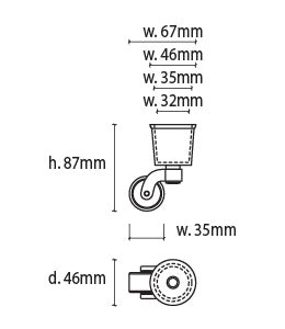 Total height of this wheel is 8.7cm, wheel width is 3.5cm, round cup is 35mm at the top opening. The surface is a polished brass gold finish. Classic brass metal casters to use on chairs and ottomans.
