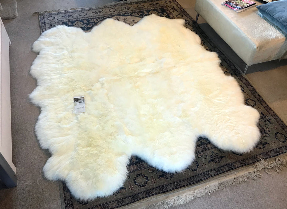 This gorgeous wool sheepskin rug uses six ivory sheepskins that are sewn together to form a large rug. Made from expertly matched New Zealand sheepskins.